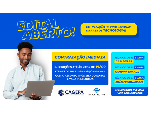 A Fundação de Educação Tecnológica e Cultural da Paraíba – FUNETEC/PB, tendo celebrado contrato com a Companhia de água e esgoto da Paraíba - CAGEPA, e considerando as normas contidas no presente Edital, TORNA PÚBLICO que estarão abertas as inscrições do PROCESSO SELETIVO SIMPLIFICADO para CONTRATAÇÃO do TIPO BOLSA de TÉCNICO DE INFORMÁTICA, para contratação de imediato e formação de Cadastro Reserva de até 5 (Cinco)selecionados por ordem classificatória, referente a prestação de serviços no ambiente coorporativo da Cagepa, constituindo a Regulamentação do Processo Seletivo na forma prevista no presente EDITAL e instruções que o íntegra.